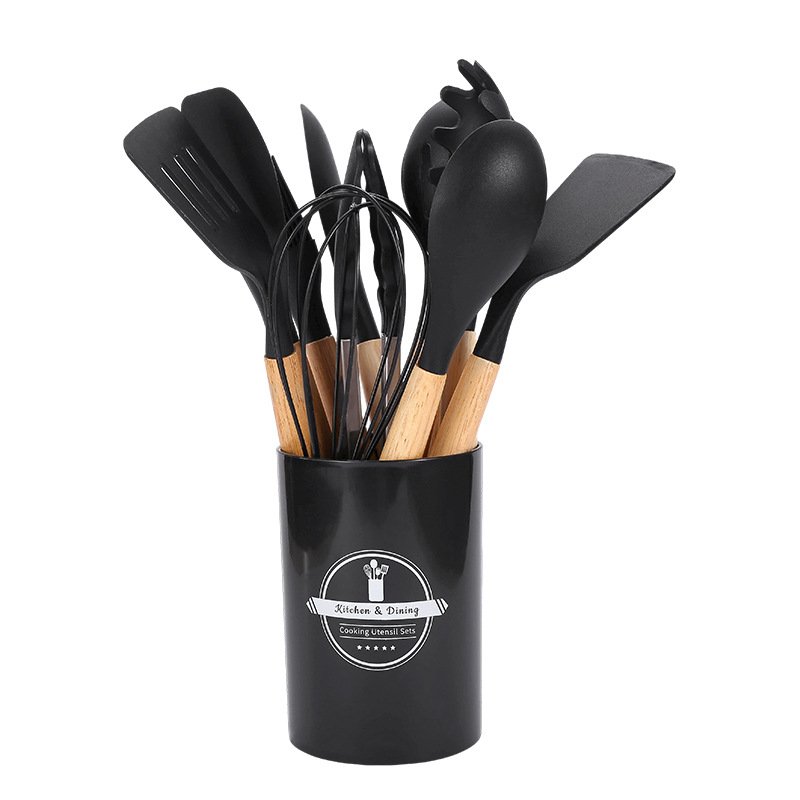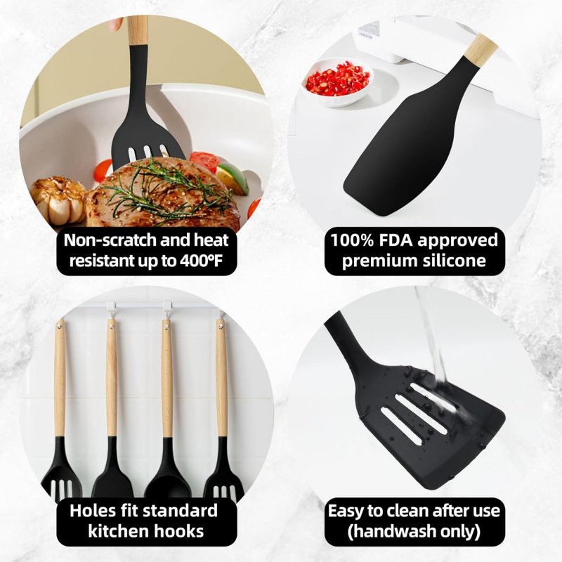 Conjunto de Utensílios de Cozinha de Silicone com 12 Peças, Livre de BPA, Cabo com Acabamento em Madeira, Utensílios de Cozinha Duráveis e Antiaderentes, Ferramentas Modernas que Não Riscam